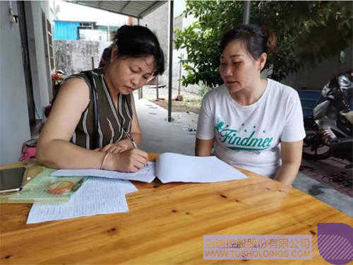 2019年9月11日,啟迪環境東方項目公司工會副主席高元霞陪同東方市總工會主任符穎嫻(左)到周秀娟(右)家了解情況