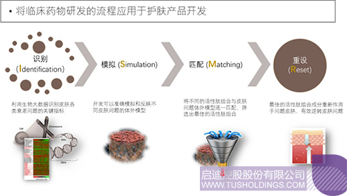 二、 功效成分篩選平臺(tái)。將臨床藥物研發(fā)的流程應(yīng)用于護(hù)膚產(chǎn)品開發(fā),針對(duì)不同皮膚衰老問題,建立集識(shí)別(Identification)、模擬(Simulation)、匹配(Matching)以及重設(shè)(Reset)為一體的I.S.M.R的流程。在此基礎(chǔ)上與分泌型天然多肽因子庫(kù)有機(jī)結(jié)合,目標(biāo)導(dǎo)向化高效篩選創(chuàng)新型多肽成分組合。