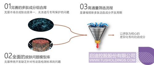1)完善的多肽成分組合庫(kù),種類與組合化,克服市場(chǎng)合成肽功效單一,無法進(jìn)行專利保護(hù)的問題;