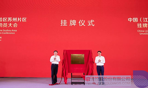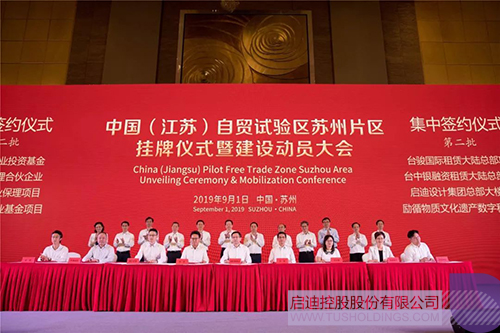 9月1日上午,中國(江蘇)自貿試驗區蘇州片區(以下簡稱“蘇州自貿區”)掛牌儀式暨建設動員大會隆重舉行。江蘇省委常委、蘇州市委書記周乃翔,蘇州市委副書記、市長李亞平為蘇州自貿區揭牌。大會現場舉行了包括啟迪設計集團新總部大樓在內的32個自貿區項目集中簽約儀式,啟迪設計集團董事長戴雅萍、總裁查金榮受邀出席掛牌儀式,戴雅萍董事長作為公司代表上臺簽約。