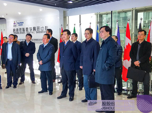 張金生副總裁(前排右一)陪同唐超副市長(前排右三)參觀啟迪控股數字展廳