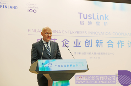 6月28日,值芬蘭共和國(guó)總理西皮萊閣下訪問(wèn)中國(guó)之際,芬蘭貿(mào)易投資旅游促進(jìn)總署率芬蘭50余家知名企業(yè)和啟迪控股攜手舉辦“TusLink-中芬企業(yè)創(chuàng)新合作論壇”,旨在通過(guò)TusLink打造眾星互動(dòng)的國(guó)際化創(chuàng)新生態(tài)系統(tǒng)。芬蘭經(jīng)濟(jì)與就業(yè)部副部長(zhǎng)古澤森(Jari Gustafsson),啟迪控股副總裁、啟迪之星董事長(zhǎng)張金生出席活動(dòng)并致辭。