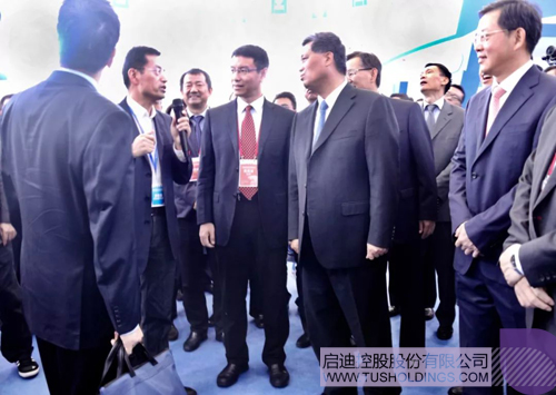 湛江啟迪董事長兼總經理吳鷹(前排左二)向廣東省省長馬興瑞(前排右二)匯報啟迪海洋科技展覽情況