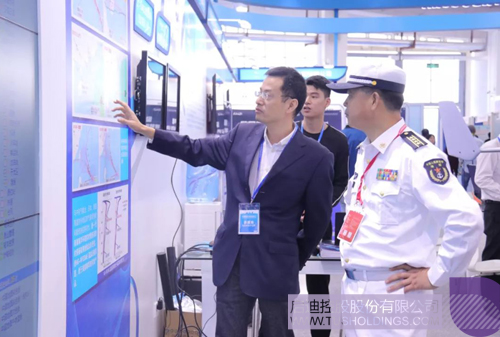 某艦隊領導饒有興趣地參觀湛江啟迪展區,詳細了解集成了風暴潮、海浪等預警成果、實時雷達數據與海域無人機及海上無線通信技術的“啟迪海洋+”科創平臺