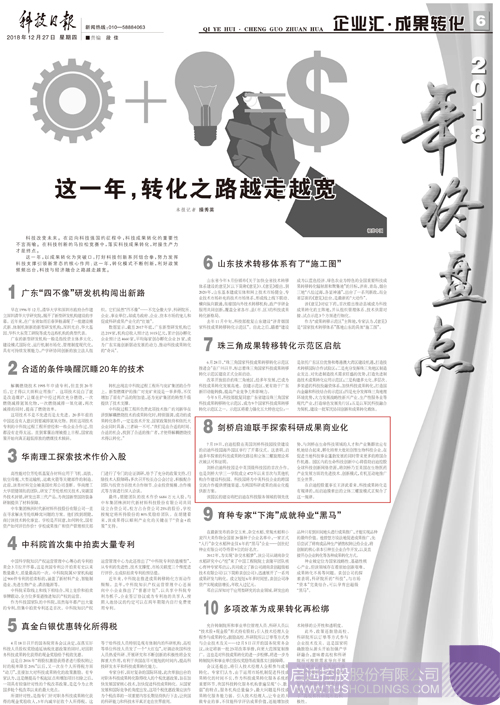 12月27日,科技日報(bào)刊文《這一年,轉(zhuǎn)化之路越走越寬》,文中提到:科技改變未來。在邁向科技強(qiáng)國的征程中,科技成果轉(zhuǎn)化的重要性不言而喻。在科技創(chuàng)新的馬拉松競賽中,落實(shí)科技成果轉(zhuǎn)化,對接生產(chǎn)力才是終點(diǎn)。這一年,以成果轉(zhuǎn)化為突破口,打好科技創(chuàng)新系列組合拳,努力發(fā)揮科技支撐引領(lǐng)新常態(tài)的核心作用;這一年,轉(zhuǎn)化模式不斷創(chuàng)新,利好政策頻頻出臺(tái),科技與經(jīng)濟(jì)融合之路越走越寬。