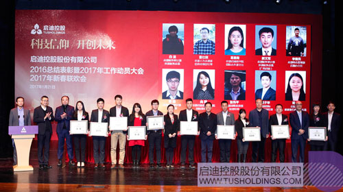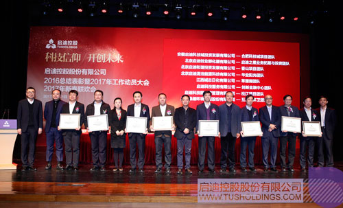 隨后,啟迪控股黨委書記、副董事長李志強宣讀了《啟迪控股關于表彰2016年度優秀團隊和先進工作者的決定》,啟迪清潔能源集團高萍等53名同志獲得啟迪控股2016年度“先進工作者”榮譽稱號;啟迪控股高級副總裁、啟迪科技城總裁、北京啟迪董事長陳文斌,啟迪控股副總裁、啟迪數字集團董事長趙東,亞都環保總裁龍林,啟迪控股高級副總裁、啟迪商學院院長臧明4人獲得啟迪控股2016年度“總裁特別獎”榮譽稱號;安徽啟迪合肥科技城項目工作團隊等16支團隊獲得啟迪控股2016年度“優秀團隊”榮譽稱號。主席臺就座領導為獲得表彰的優秀團隊代表和先進個人頒獎。同期,大會還對13個部門、機構,9個獲得社會榮譽的個人和機構提出表揚。